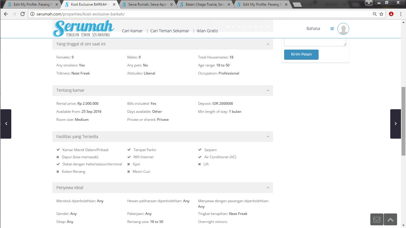 Kan udah banyak yang daftar buat cari roommate. Kalian tinggal klik gambarnya, terus muncul deh detail si calon roommate. Ada keterangan biaya maksimum yang bisa dibayar, ngerokok atau nggak, punya hewan piaraan atau nggak, sama yang paling penting ada nomor kontaknya. Jadi kalo ngerasa cocok, tinggal hubungi secara langsung aja.