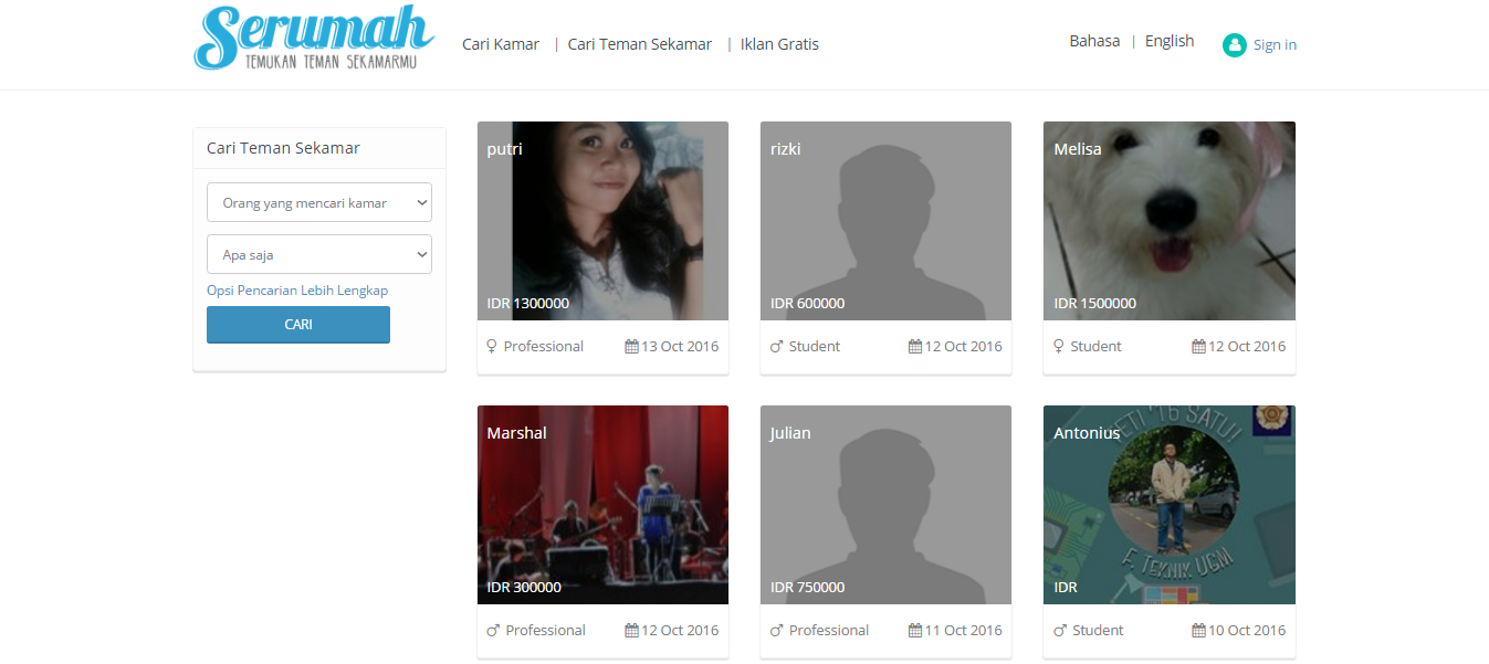 Ayo deh tunggu apalagi pindah kosan sekarang buat dapetin suasana baru dan pastinya budget bisa di tanggung berdua dengan fitur cari teman sekamar. Apalagi saat ini khususnya di kota besar seperti Jakarta, trend berbagi kamar (room sharing) semakin hype. Serumah ingin memfasilitasi mahasiswa dan juga profesional muda yang mencari roommate (teman sekamar) untuk dapat menggunakan fitur dari website serumah.com