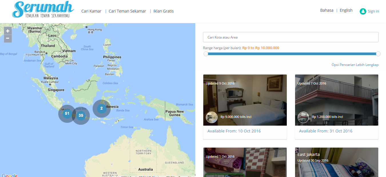 Nah itu dia tampilan awal dari serumah.com yang bakal mempermudah kalian buat dapetin kamar atau kos-kosan. Jadi kalian gak perlu tanya-tanya lagi sama satpam, gak pertu tanya temen, gak perlu tanya mantan.(ups keceplosan)