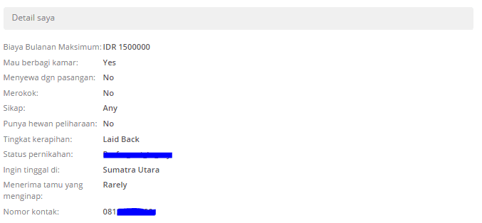 Selain beberapa laman penting yang nggak tersedia, ada 1 hal lagi yang menurut saya bisa menjadi pisau bermata dua yaitu pada menu cari teman sekamar di bagian detail pengguna terdapat nomor telepon pengguna yang memungkinkan pengguna lain untuk menghubungi si pencari teman sekamar dengan lebih cepat, namun hal ini juga memiliki dampak negatif karena dapat disalah gunakan oleh pihak yang nggak bertanggung jawab. Jadi menurut saya hal ini seharusnya dikaitkan dengan laman privacy policy dan juga terms of service untuk menjelaskan kegunaan dari nomor telepon tersebut atau ada baiknya nomor telepon dihapus dari detail pengguna karena nomor telepon menurut saya bersifat pribadi