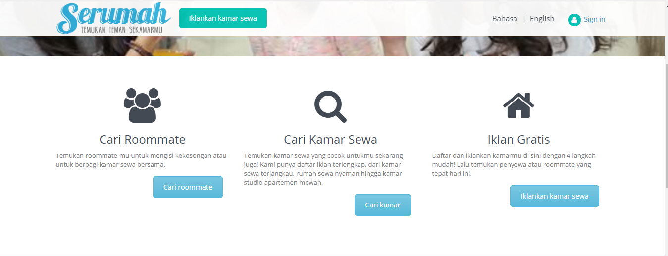 serumah.com adalah platform yang menghubungkan pengguna untuk mencari teman sekamar dan berbagi kamar. Mereka yang ingin berbagi kamar sewa (sharing room rent) bisa mengiklankan kamar mereka di Serumah dan mencari roommate disini. Jadi, tujuan sebenarnya dari platform ini adalah untuk menghubungkan mereka yang membutuhkan teman untuk berbagi biaya sewa pada sebuah penginapan. Contohnya si Han yang tidak sanggup membayar keseluruhan biaya penginapan/kos dll, terus dia memilih si Rey di