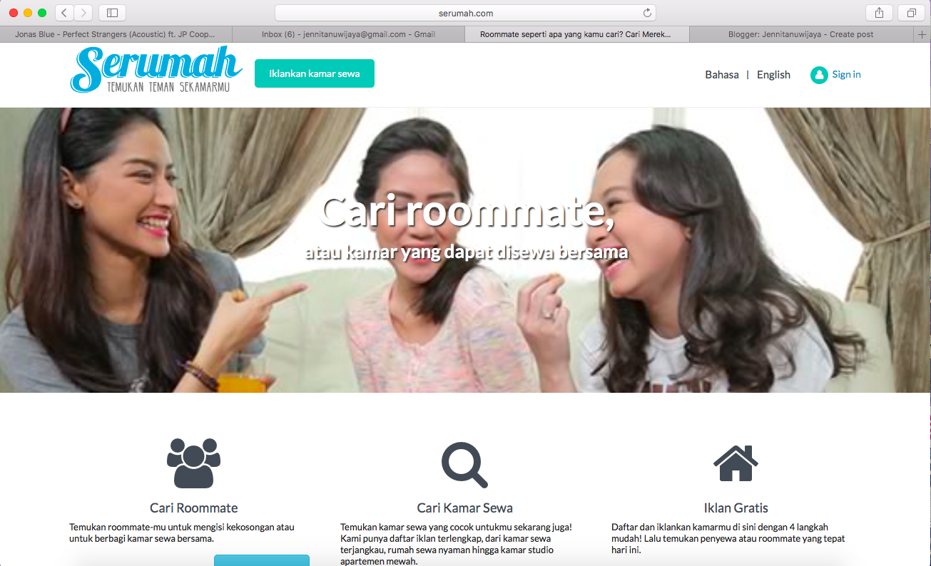Kali ini aku akan membahas tentang salah satu online platform yang memfasilitasi pengguna untuk mencari kamar, menyewakan kamar, ataupun mencari teman sekamar. Target utama pengiklan di serumah.com adalah mereka yang menyewa kamar dan membutuhkan teman untuk berbagi biaya, bukan para pemilik kos/kamar.